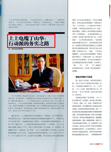 十一月的黃昏,散發著午后的余溫,我們到達溧陽,來到了江蘇上上電纜集團有限公司。作為國內唯一一家能夠提供全系列核電站用電纜的企業,電纜行業唯一一家“裝備中國功勛企業”,一個個閃耀的頭銜讓上上在業內無人不知、無人不曉。而我始終認為,一個企業的領導者就像一場戰役的指揮者,戰役成功與否除了天時地利人和,還離不開指揮者個人的素養和謀略。和丁山華董事長在會議室如約而見,高瘦的身材、親切的微笑、平和的話語讓人忽視了他的皺紋和白發,崇拜之余更添了幾分好奇:他是如何用一種平凡創造了不平凡?